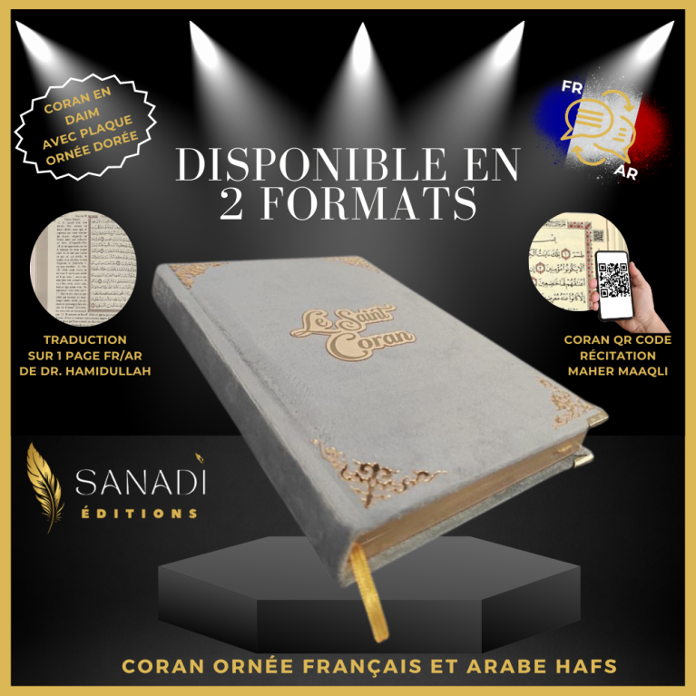 Explorez en détail le Saint Coran en Français et Arabe par Édition Sanadi, avec des caractéristiques telles que la lecture en Arabe Hafs, les tailles disponibles, la couverture en simili cuir avec dorure, la calligraphie Othamni de Othman Taha, le QR code pour la récitation de Sheikh Maher Al Maaiqli, et les marque-pages séparateurs.